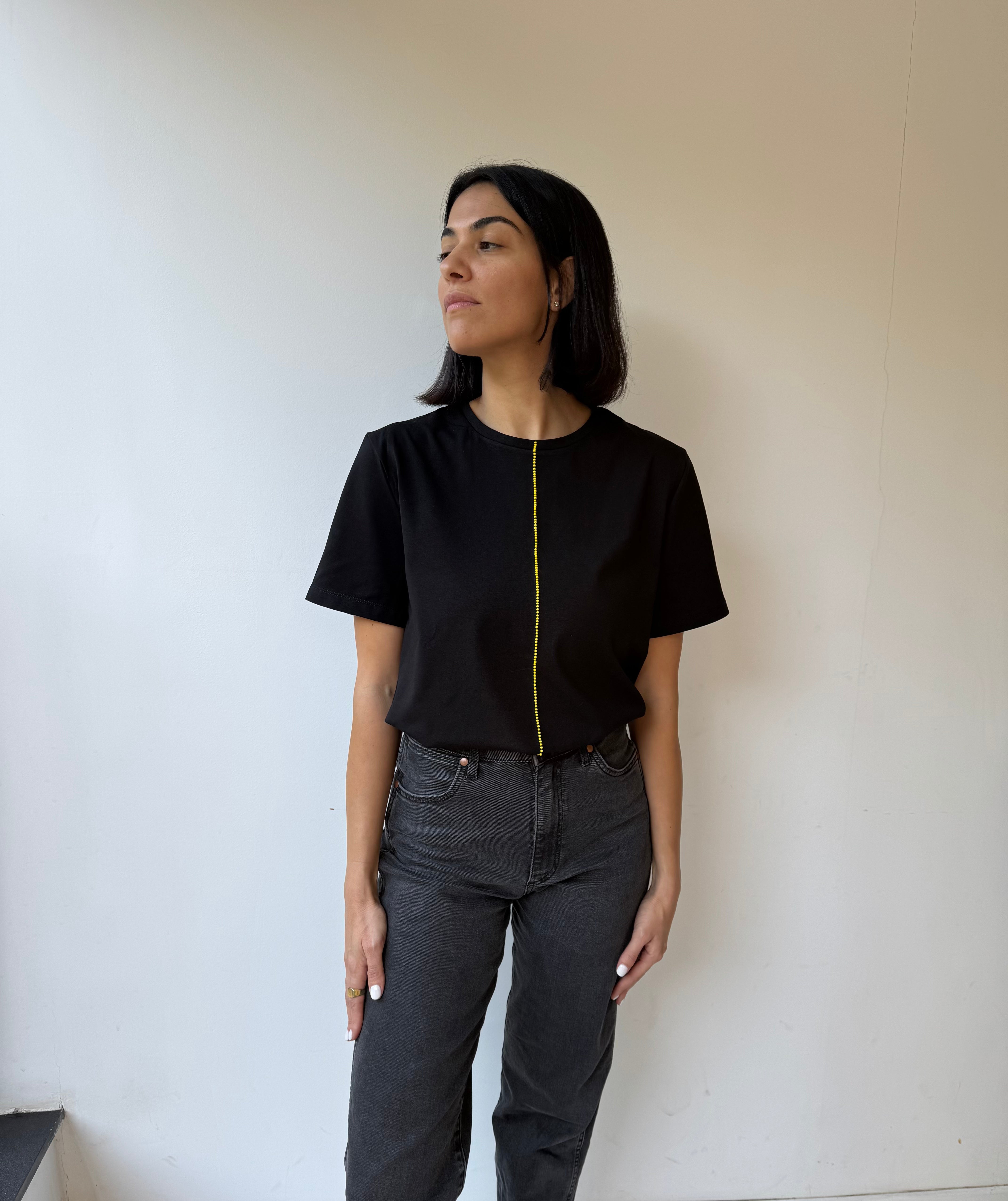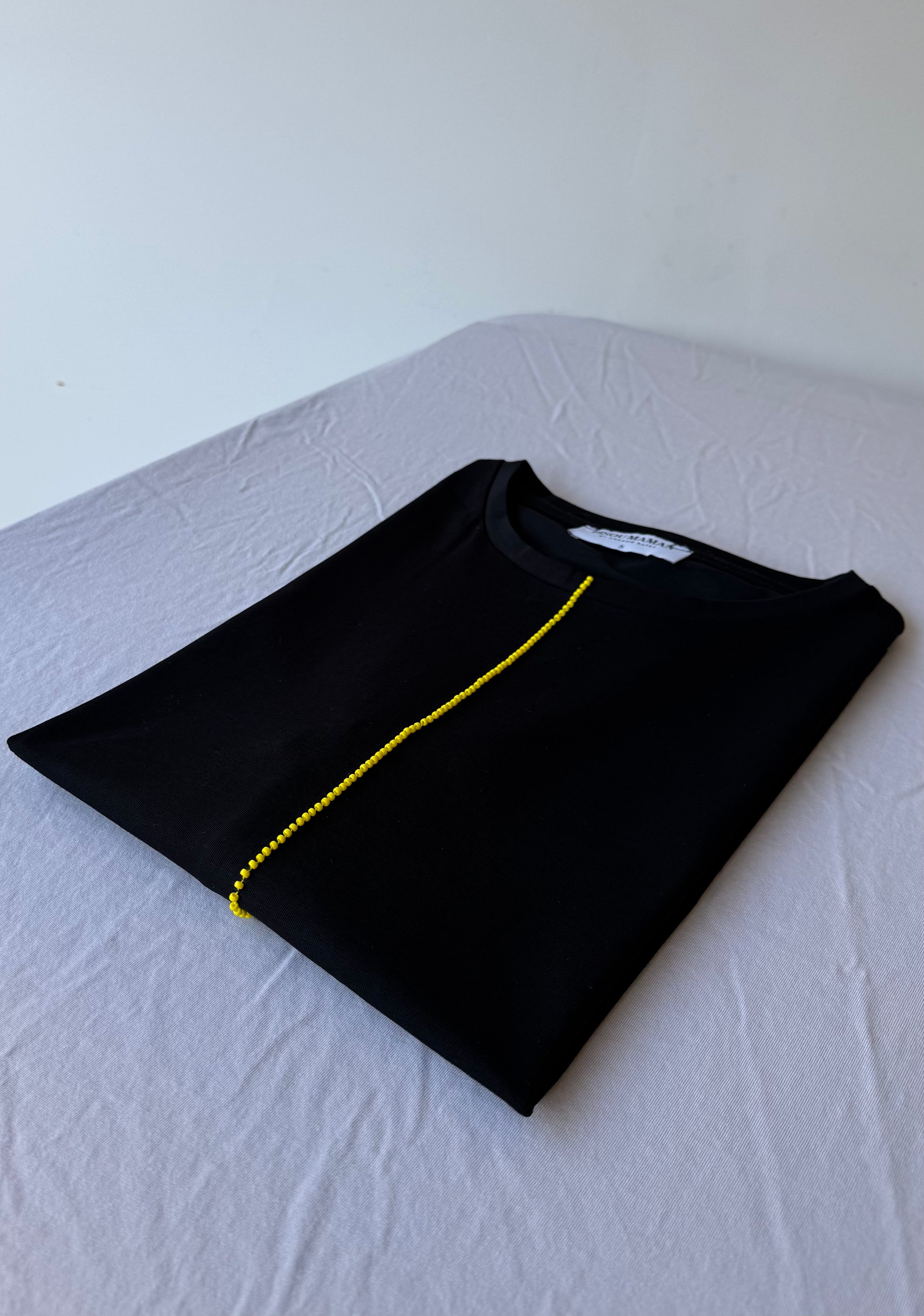 ההשראה לעיצוב נולדה מתוך רגעים של אור בתוך חושך, קו חרוזים עדין בעבודת יד חוצה את החולצה לשניים, כסמל לחיבור בין ניגודים, לתקווה, ולאור שממשיך לזרוח.